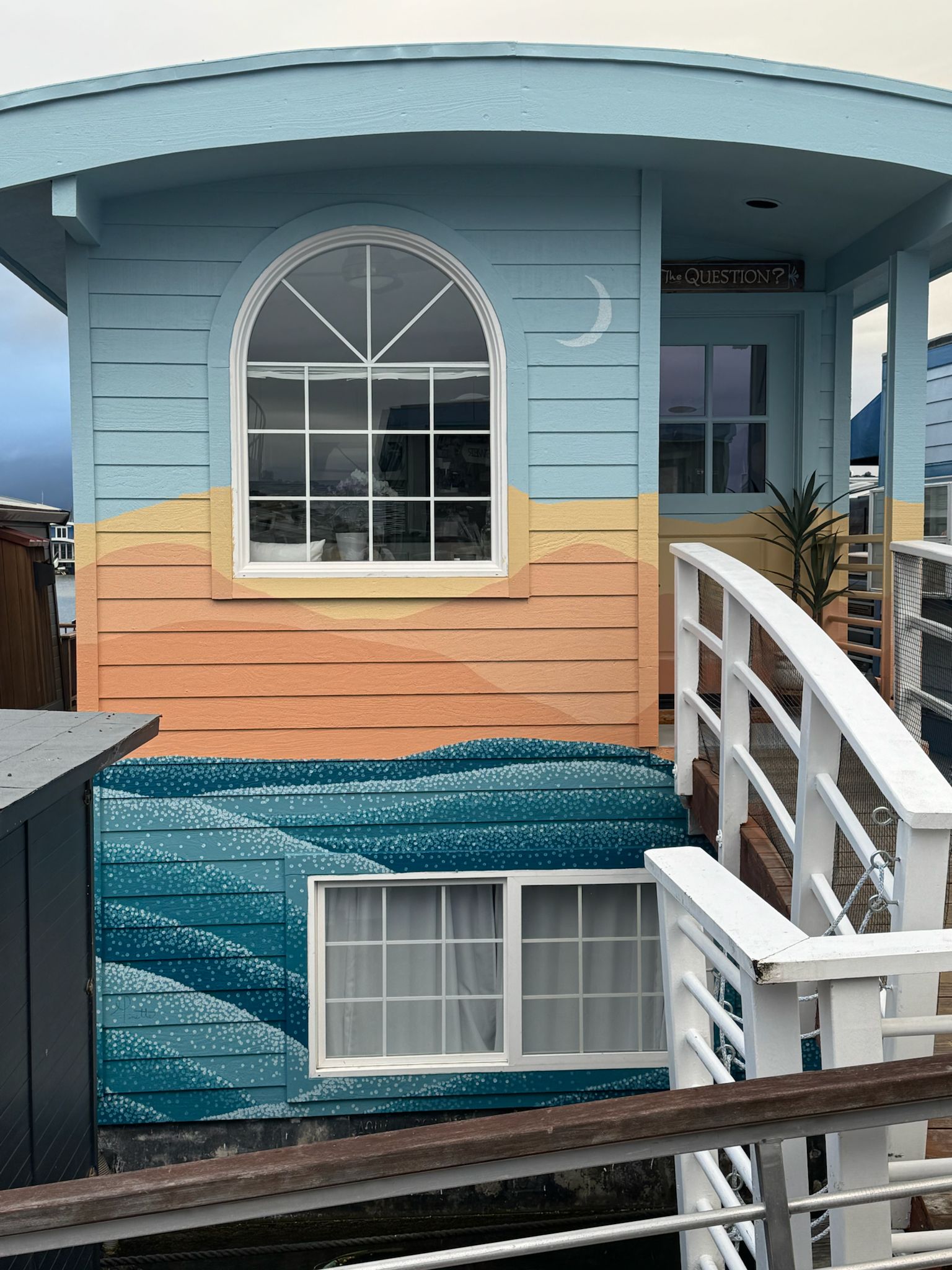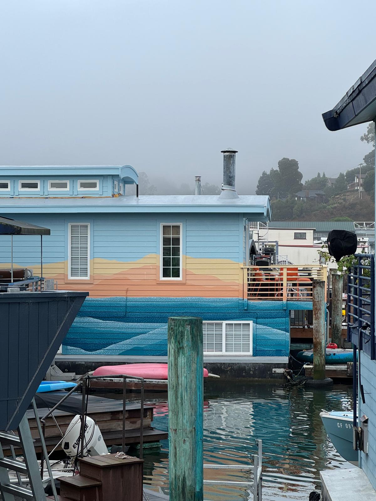 This large-scale exterior mural was created for a floating home in the historic Sausalito houseboat community. The piece transforms the entire façade into a soft, atmospheric landscape - merging ocean, horizon, and sky into a continuous gradient that wraps around the home’s structure. The design brings a sense of calm movement to the dock, blending seamlessly with the surrounding marina and natural environment.